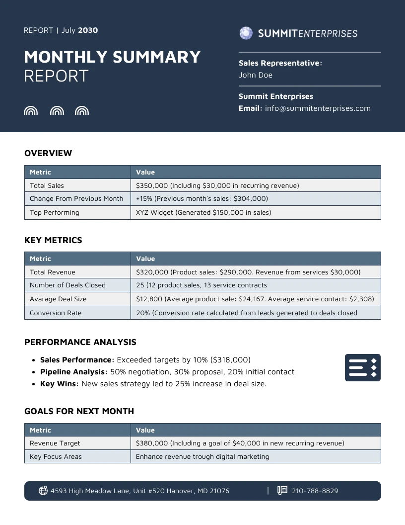 An effective monthly summary report typically includes several key sections designed to provide a comprehensive overview of your activities. While the specific components might vary slightly depending on your role or industry, these core elements form the backbone of most useful reports: