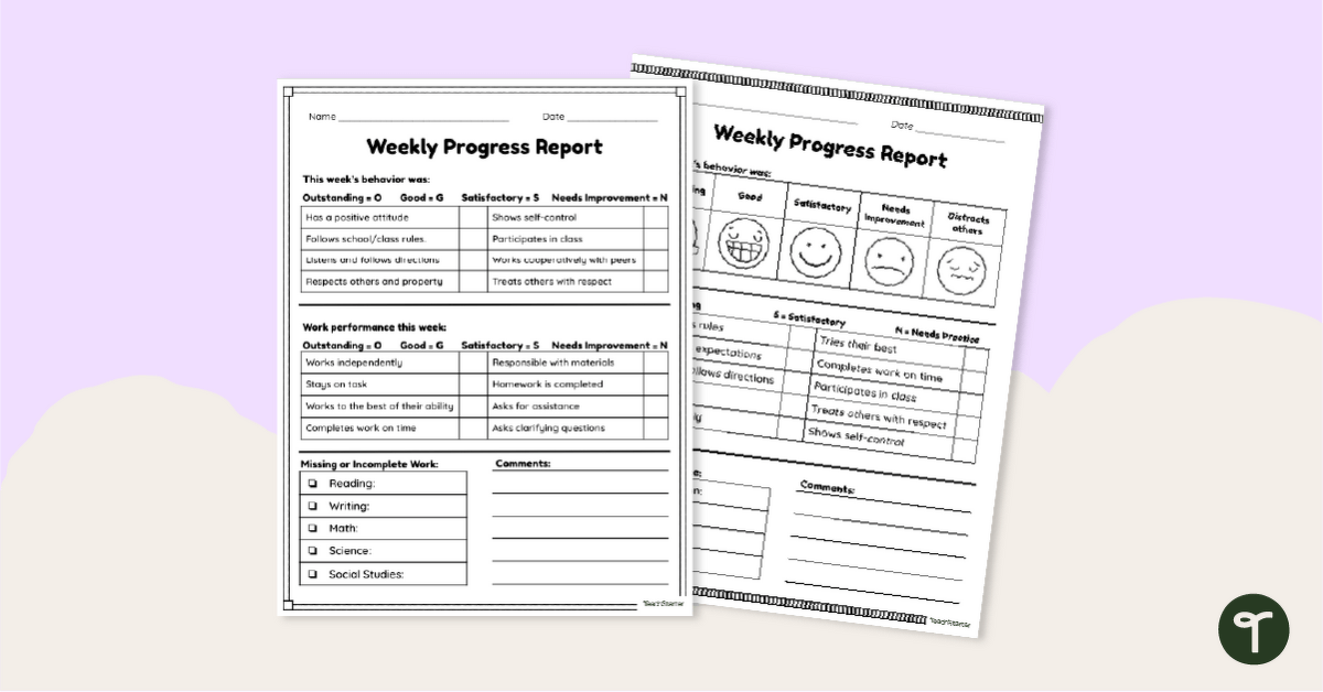 - Student Information: Name, grade, reporting period (e.g., Week of…).